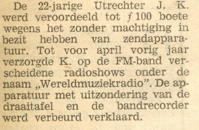 Eind 1976 viel de eerste dagvaarding bij mij in de brievenbus. De officier van Justitie riep mij op om maandag 31 januari 1977 om 15:30 uur op de Hamburgerstraat in Utrecht te verschijnen. De vrouwelijke politierechter kon de humor van het geheel wel inzien en strafte mij mild. Ik kreeg zelfs nog een deel van de apparatuur terug. Toen ik de rechtbank uitstapte zat de schrik er bij mij toch wel goed in.