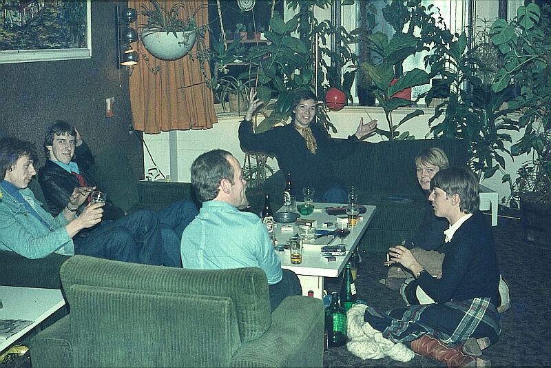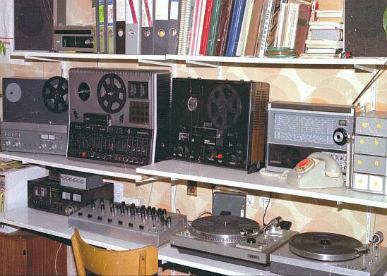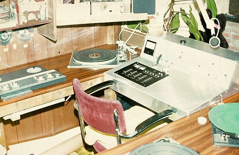 Foto: mei 1977, WMR studio-zenderlocatie bij Gerard van Dam en Astrid de Jager boven de zaak in de woonkamer op de Vaillantlaan in Den Haag