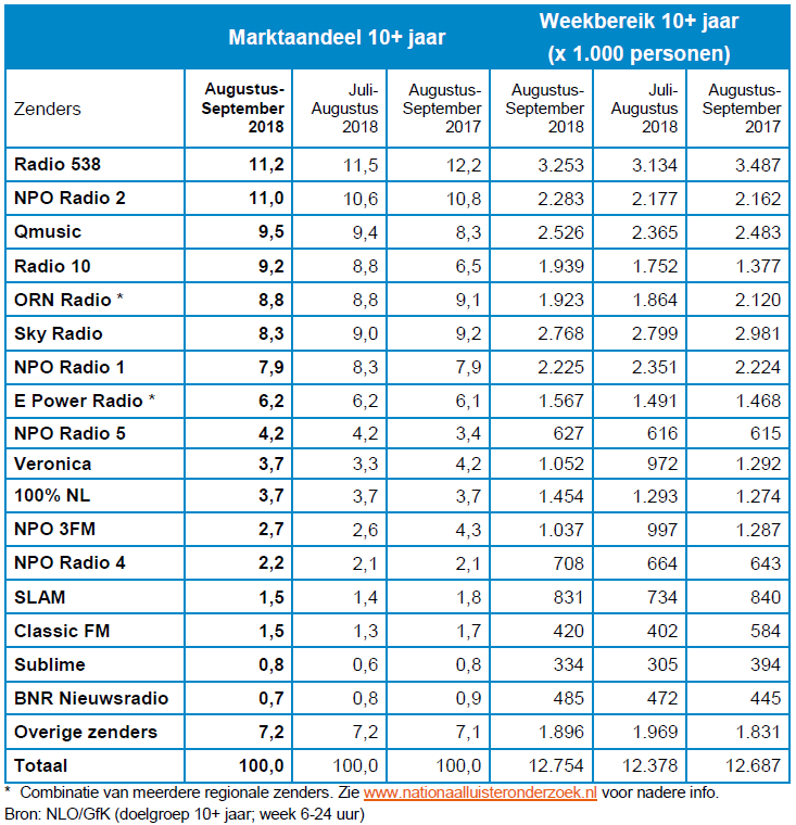 De luistercijfers van het Nationaal Luister Onderzoek over de periode augustus-september 2018 zijn bekendgemaakt. De rapportage is gebaseerd op een landelijk representatieve steekproef van 7.095 respondenten van 10 jaar en ouder. De gemiddelde luistertijd is in deze periode 2 uur en 24 minuten per dag.