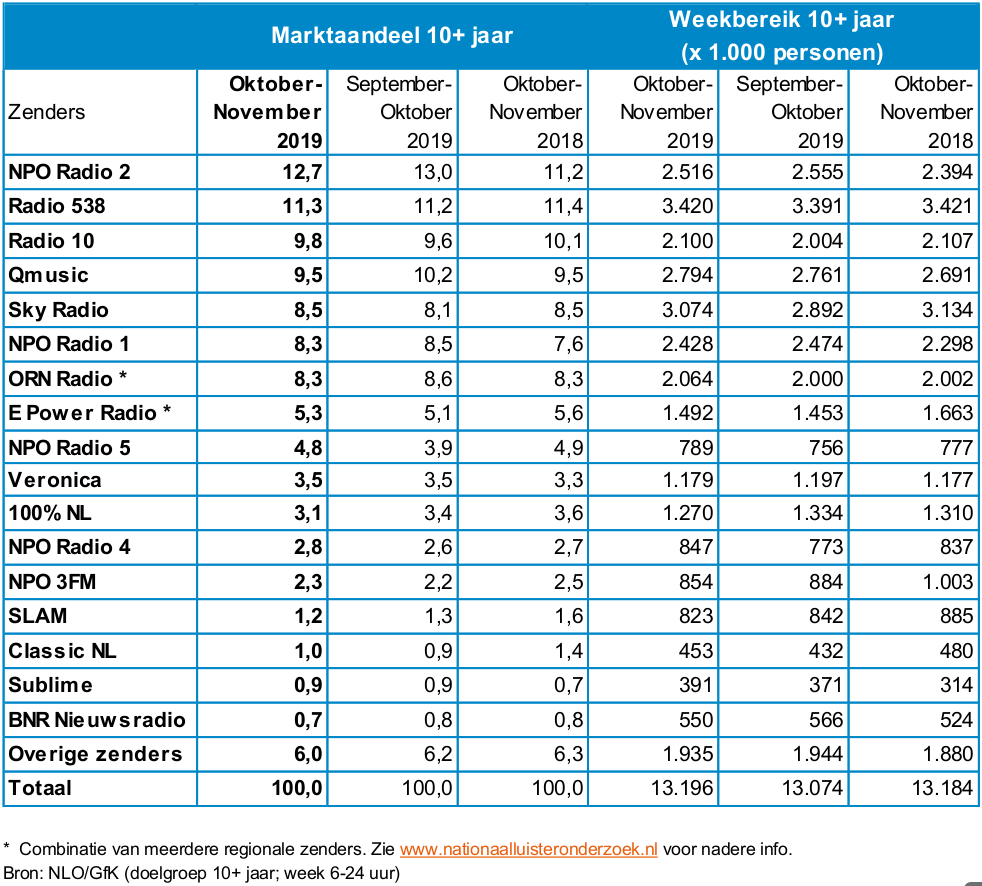 De luistercijfers van het Nationaal Luister Onderzoek over de periode oktober-november 2019 zijn bekendgemaakt. De rapportage is gebaseerd op een landelijk representatieve steekproef van 7.955 respondenten van 10 jaar en ouder. De gemiddelde luistertijd is in deze periode 2 uur en 37 minuten per dag.
