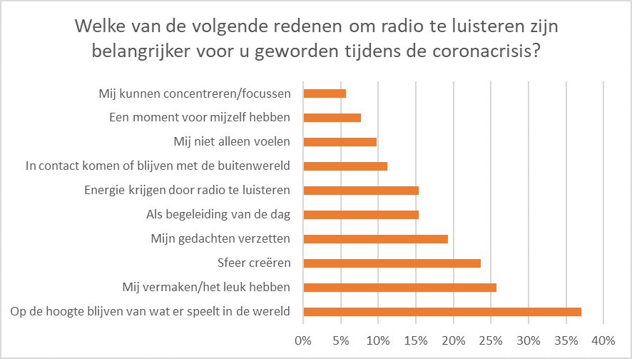 Op de hoogte blijven van het nieuws (37%), vermaak (26%) het creëren van sfeer (24%) en het verzetten van gedachten (19%) zijn voor Nederlanders in deze coronatijden belangrijkere redenen geworden om radio te luisteren.