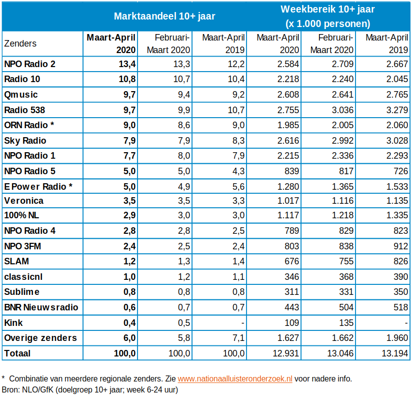 De luistercijfers van het Nationaal Luister Onderzoek over de periodemaart-april 2020 zijn bekendgemaakt. De rapportage is gebaseerd op een landelijk representatieve steekproef van 8.247 respondenten van 10 jaar en ouder. De gemiddelde luistertijd is in deze periode 2 uur en 47 minuten per dag (vorige periode: 2 uur en 42 minuten). De gemiddelde luistertijd van de luisteraars is 4 uur en 30 minuten (vorige periode: 4 uur en 17 minuten).