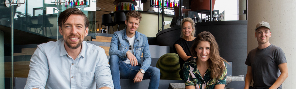 Afbeelding: Het hele on airteam van de ochtendshow (v.l.n.r.: Mattie Valk, Tom de Graaf, Anne-Marie Rozing, Marieke Elsinga en Joe Stam) (foto Qmusic)