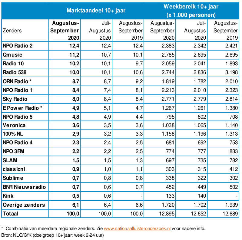 De luistercijfers van het Nationaal Luister Onderzoek over de periode augustus-september 2020 zijn bekendgemaakt. De rapportage is gebaseerd op een landelijk representatieve steekproef van 8.465 respondenten van 10 jaar en ouder. De gemiddelde luistertijd is in deze periode 2 uur en 25 minuten per dag (vorige periode: 2 uur en 27 minuten). De gemiddelde luistertijd van de luisteraars is 4 uur en 2 minuten (vorige periode: 4 uur en 10 minuten).
