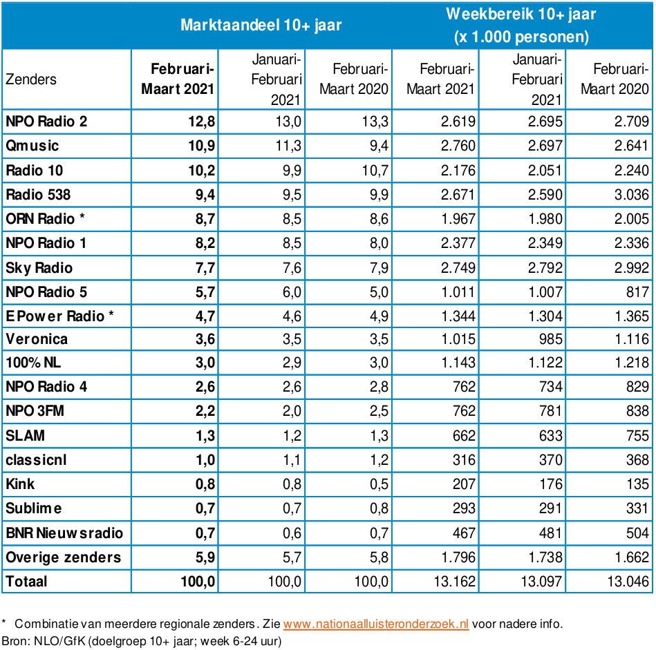 De luistercijfers van het Nationaal Luister Onderzoek over de periode februari-maart 2021 zijn bekendgemaakt. De rapportage is gebaseerd op een landelijk representatieve steekproef van 8.542 respondenten van 10 jaar en ouder. De gemiddelde luistertijd is in deze periode 2 uur en 42 minuten per dag (vorige periode: 2 uur en 44 minuten). De gemiddelde luistertijd van de luisteraars is 4 uur en 20 minuten (vorige periode: 4 uur en 24 minuten).