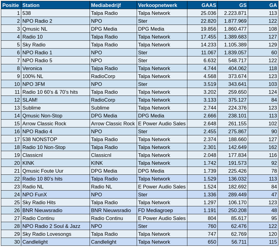 - Ongeldige sessies en sessies beluisterd buiten Nederland worden eruit gefilterd. Ongeldige sessies zijn sessies korter dan 1 minuut, langer dan 24 uur, ontstaan door bots en spiders, gecreëerd door datacenters en intern verkeer bij publishers.