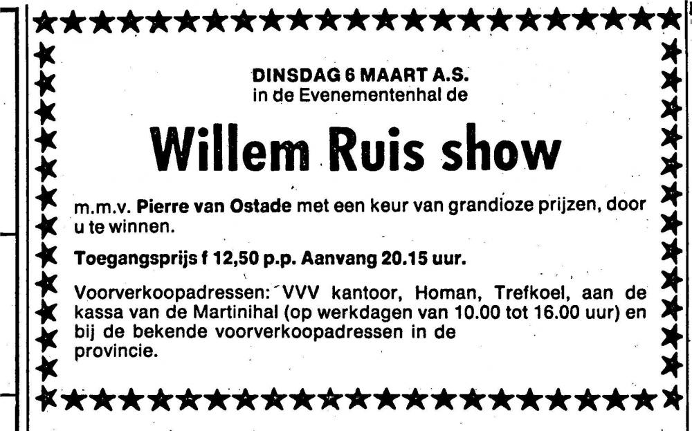 Artiesten op tour door het land was in de jaren zeventig van de vorige eeuw een normale zaak maar daar kwam in 1979 een nieuwigheid bij namelijk de populaire presentator, die met zijn nationale bekendheid, het aandurfde ook het land in te gaan. Het betrof Willem Ruis, die vooral de aandacht had getrokken op de wijze waarop hij zijn KRO-quiz presenteerde. Eind februari 1979 werd bekend dat hij naar Groningen kwam met een eigen theaterprogramma in de Evenementenhal, destijds onderdeel van het Martinihalcomplex. In de aankondiging stond te lezen dat op dinsdagavond 6 maart hij, zonder het gebruik van camera’s, een optreden zou geven. In het Nieuwsblad van het Noorden was te lezen op de laatste dag van februari 1979: ‘De glamourboy van het beeldscherm, geliefd en gevreesd om zijn scherpe opmerkingen