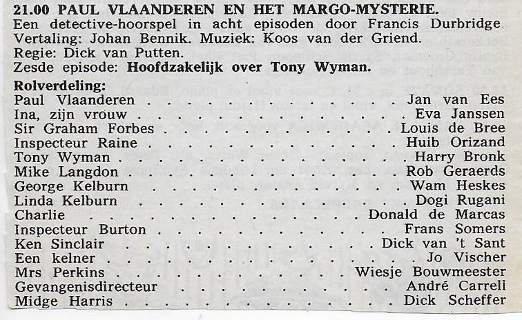 Ik was 13 jaar toen in 1962 één van de hoorspelen met meer dan normale aandacht werden gevolgd. Leeftijdgenoten zetten zich meteen schrap als ik de naam ‘Paul Vlaanderen’ noem. In 1962 was er ‘Het Margo Mysterie’ in acht afleveringen die om 9 uur in de avond wekelijks werd uitgezonden op de radio. Van origine geschreven door Francis Durbridge en voor Nederland vertaald door Johan Bennik. Zoals destijds bij elk hoorspel diende er muziek ter begeleiding worden gecomponeerd en gebracht, waarvoor in Nederland destijds Koos van der Griend verantwoordelijk was. Bekende en minder bekende namen uit de hoorspelkern van die tijd waren er te horen, waaronder Jan van Ees, Eva Janssen, Wiesje Bouwmeester, Dick Scheffer, André Carrell (de vader van) en Donald de Marcas.