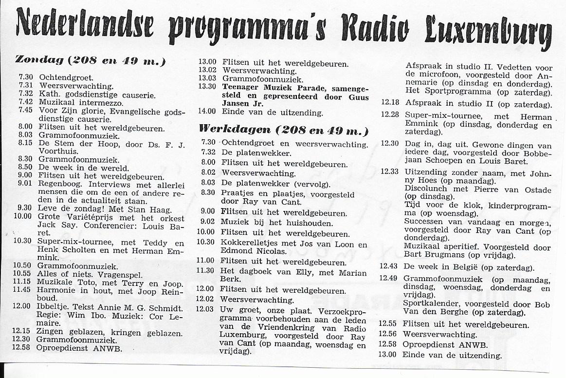 Radio luisteren is een gezonde ziekte gebleken waarbij als jonge knaap toch bepaalde dingen gingen opvallen. Zo was er een grote variatie aan Nederlandstalige programma’s op Radio Luxembourg, waarvan ik graag het programma ‘Discolunch’ noem dat op de dinsdagmiddag werd gepresenteerd door Pierre van Ostade. Het kwam dan ook heel vreemd over dat dezelfde presentator opeens ook op Radio Veronica was te beluisteren en wel iedere dinsdag en donderdagmiddag om half 6 met ‘Het Platenpallet’. Kijk eens naar het overzicht van de Nederlandse programma’s op Radio Luxemburg in 1962, misschien vallen er namen op. In ieder geval is er een naam vet gedrukt en dat was dan ook de man die op dat moment verantwoordelijk was voor het merendeel van de programmering. Guus Janssen Jr. kwamen we later weer tegen bij Strengholt en had derhalve ook weer een vinger in de muzikale pap bij de zeezender Radio Noordzee.
