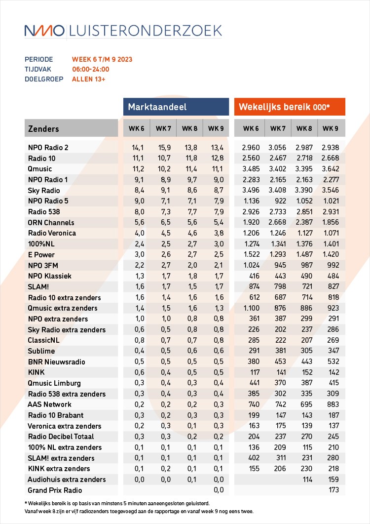 - Stijgers: 100%NL, AAS Network, Classicnl, NPO 3FM, NPO Radio 5, NPO Klassiek, Qmusic Limburg, Radio 10, Radio 10 Brabant, Radio 538, Radio 538 extra zenders, Sky Radio, SLAM!,