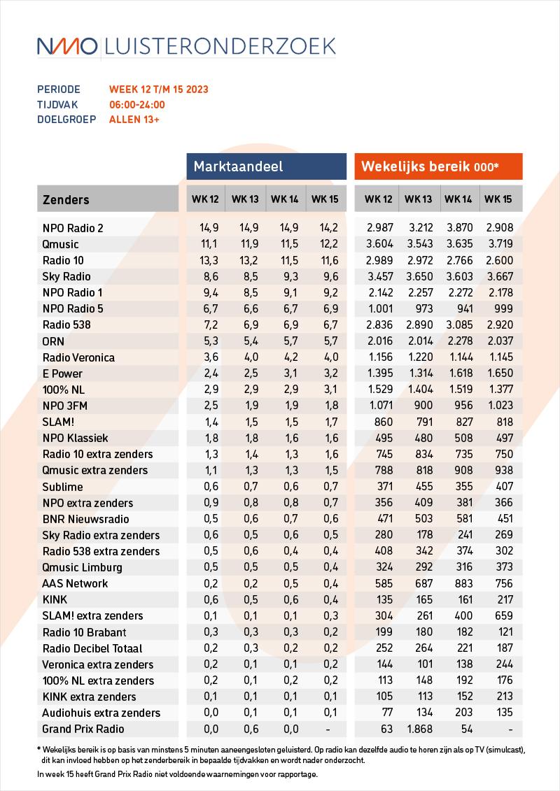 Wekelijks, op woensdagmiddag, worden de luistercijfers van de week ervoor gepubliceerd. In de week van maandag 10 t/m zondag 16 april 2023 is NPO Radio 2 wederom marktleider, Qmusic staat op de tweede plaats, Radio 10 derde. Sky Radio profiteert van de Top 1000 week en blijft vierde met hoogste marktaandeel in 2023. NPO Radio 1 blijft vijfde.