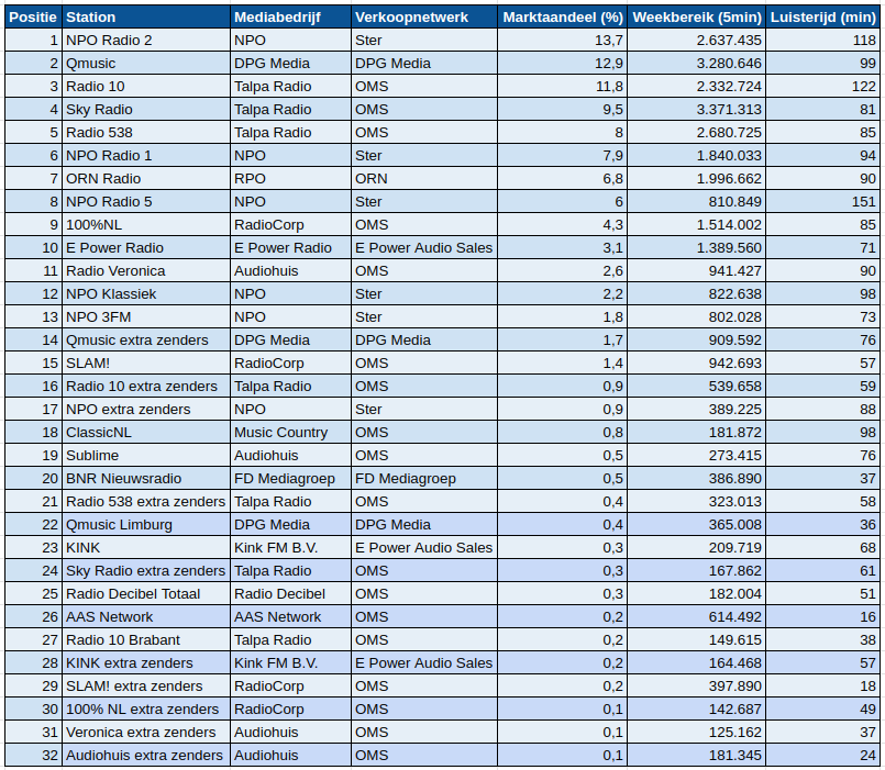 Radio 10 zakte naar de derde plaats met een marktaandeel van 11,8% (vergeleken met 13,3% in de voorgaande week), terwijl Sky Radio licht gestegen is naar een marktaandeel van 9,5% (vergeleken met 9,2% in de voorgaande week). Radio 538 maakte een positieve sprong naar de vijfde plaats met een marktaandeel van 8% (vergeleken met 7% in de voorgaande week).