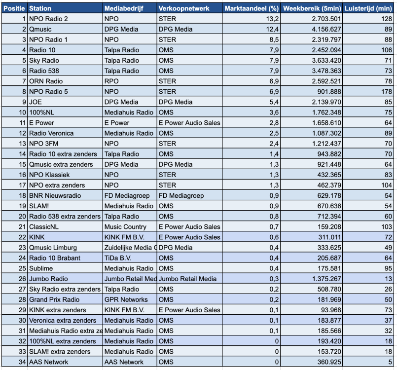 Sky Radio behoudt zijn vijfde positie met een marktaandeel van 7,9%, gelijk aan de vorige week. Radio 538, dat vorige week nog op de derde plaats stond, heeft nu een marktaandeel van 8,3%, maar is uit de top drie gevallen.