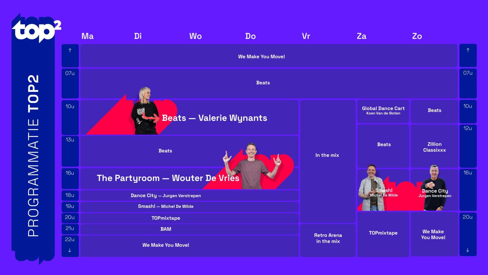 TOP2 biedt een volwaardige programmering met live shows, dj-sets en nieuwsupdates. Bekende dj’s zoals Valerie Wynants, Wouter De Vries, Michel De Wilde en Jurgen Verstrepen verzorgen de programma’s van maandag tot en met donderdag. Daarnaast krijgen opkomende dj’s uit België de kans om hun talent te laten horen in het programma TOPmixtape. Op vrijdag wordt de zender omgedoopt tot ‘Friday Mixday’, met sets van zowel nationale als internationale dj’s.