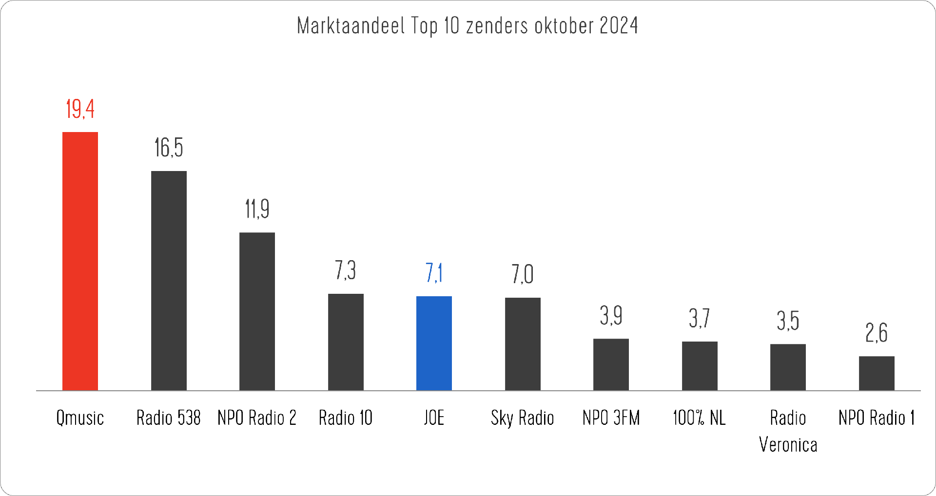 De radiogroep van DPG Media, bestaande uit Qmusic, JOE en verschillende themazenders, bereikte in oktober een gezamenlijk marktaandeel van 28,8% in de doelgroep 20-49 jaar. Het totale bereik in de leeftijdsgroep 13+ kwam uit op 9,9 miljoen luisteraars, een stijging van bijna 1 miljoen luisteraars (+11%) in vergelijking met dezelfde periode vorig jaar.