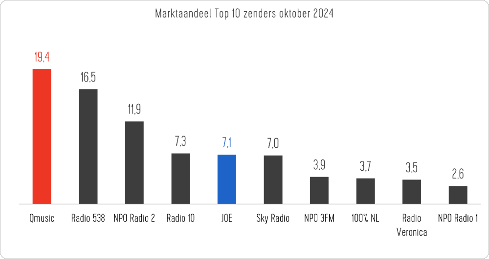Uit de nieuwste luistercijfers van het Nationaal Media Onderzoek (NMO) blijkt dat JOE in oktober een nieuw hoogtepunt heeft bereikt met een marktaandeel van 7,1% in de doelgroep 20-49 jaar. Daarmee is de zender van DPG Media de vijfde grootste radiozender van Nederland geworden. Het totale bereik van JOE steeg naar 4,7 miljoen luisteraars in de leeftijd 13+, een groei van 46% ten opzichte van dezelfde periode vorig jaar.