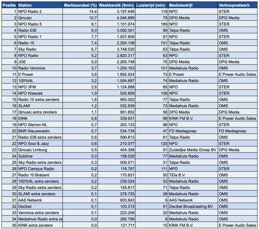 Radio 538 behoudt de vierde plaats met een marktaandeel van 9,0% (vorige week 6,54%). NPO Radio 1 blijft op de vijfde plek met 7,7%, een lichte toename vergeleken met 6,4% in de vorige week.