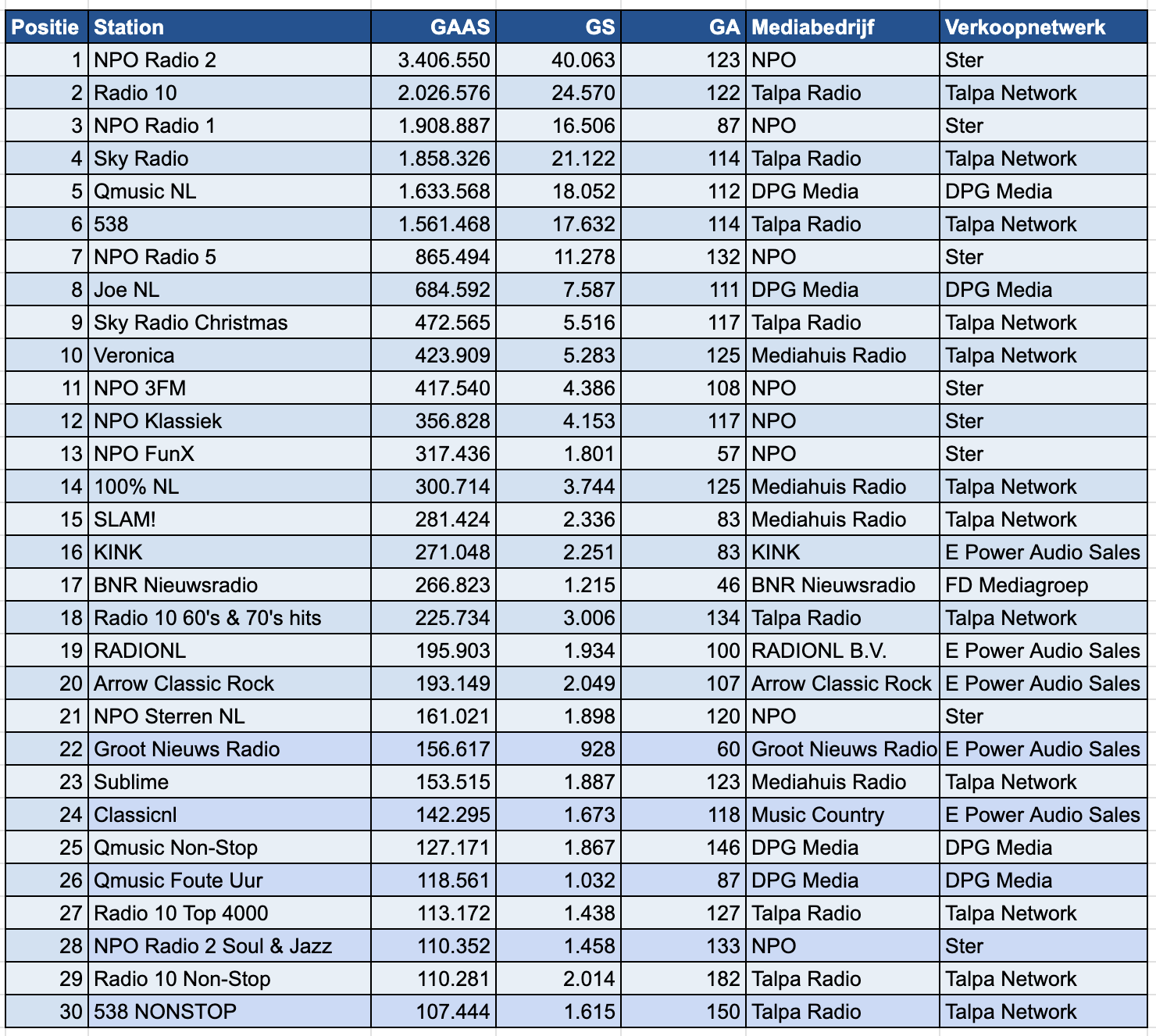 De eindejaarsprogrammering had een merkbare invloed op de populariteit van enkele radiostations. De top 5 van december toont aanzienlijke verschuivingen in vergelijking met de voorgaande maand: