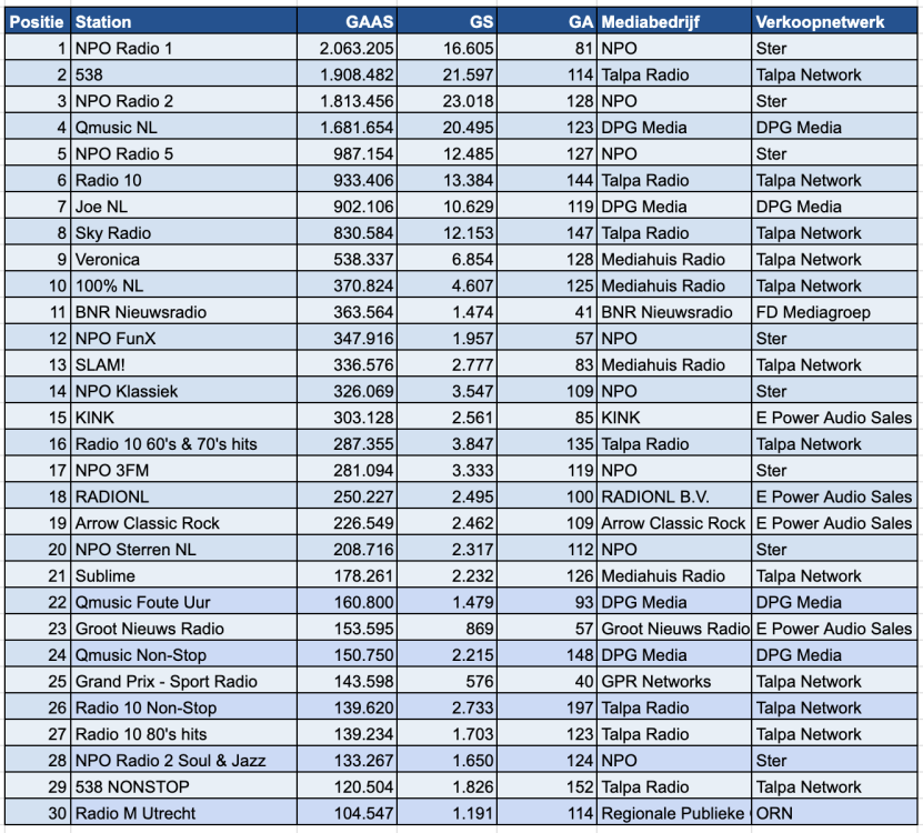 Uit de cijfers blijkt dat NPO Radio 1 in april wederom de ranglijst aanvoert met 2.063.205 actieve streams. Dit betekent een lichte daling ten opzichte van maart, toen het station 2.135.555 streams noteerde. Radio 538 behoudt de tweede plaats met 1.908.482 streams, eveneens een lichte daling ten opzichte van de vorige maand (1.960.459).