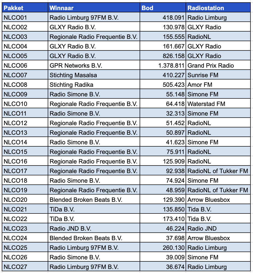 Een opvallende winnaar van de veiling is Simone FM, dat momenteel alleen in Groningen en Drenthe uitzendt. De zender breidt flink uit en zal straks ook in Gelderland, Utrecht en delen van Overijssel te horen zijn. Hitzzz, onderdeel van Simone FM, gaat uitbreiden naar Drenthe, Friesland en Overijssel. Tukker FM behoudt het grootste deel van zijn frequenties, maar verdwijnt van FM in Gelderland, Utrecht en de kop van Noord-Holland. De zender blijft wel landelijk te ontvangen via DAB+.