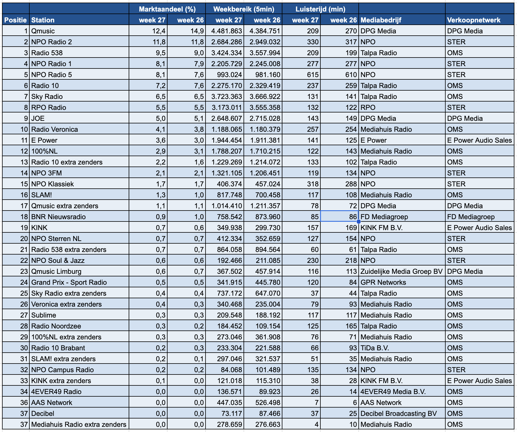 In week 27 van 2025, gemeten van 30 juni tot en met 6 juli, blijft Qmusic marktleider onder de landelijke radiozenders, ondanks een daling in marktaandeel. De zender behaalt deze week een aandeel van 12,4%, tegenover 14,9% in de voorgaande week. NPO Radio 2 blijft stabiel op de tweede plek met een marktaandeel van 11,8%. Radio 538 noteert een lichte stijging van 9,0% naar 9,5% en behoudt de derde positie.