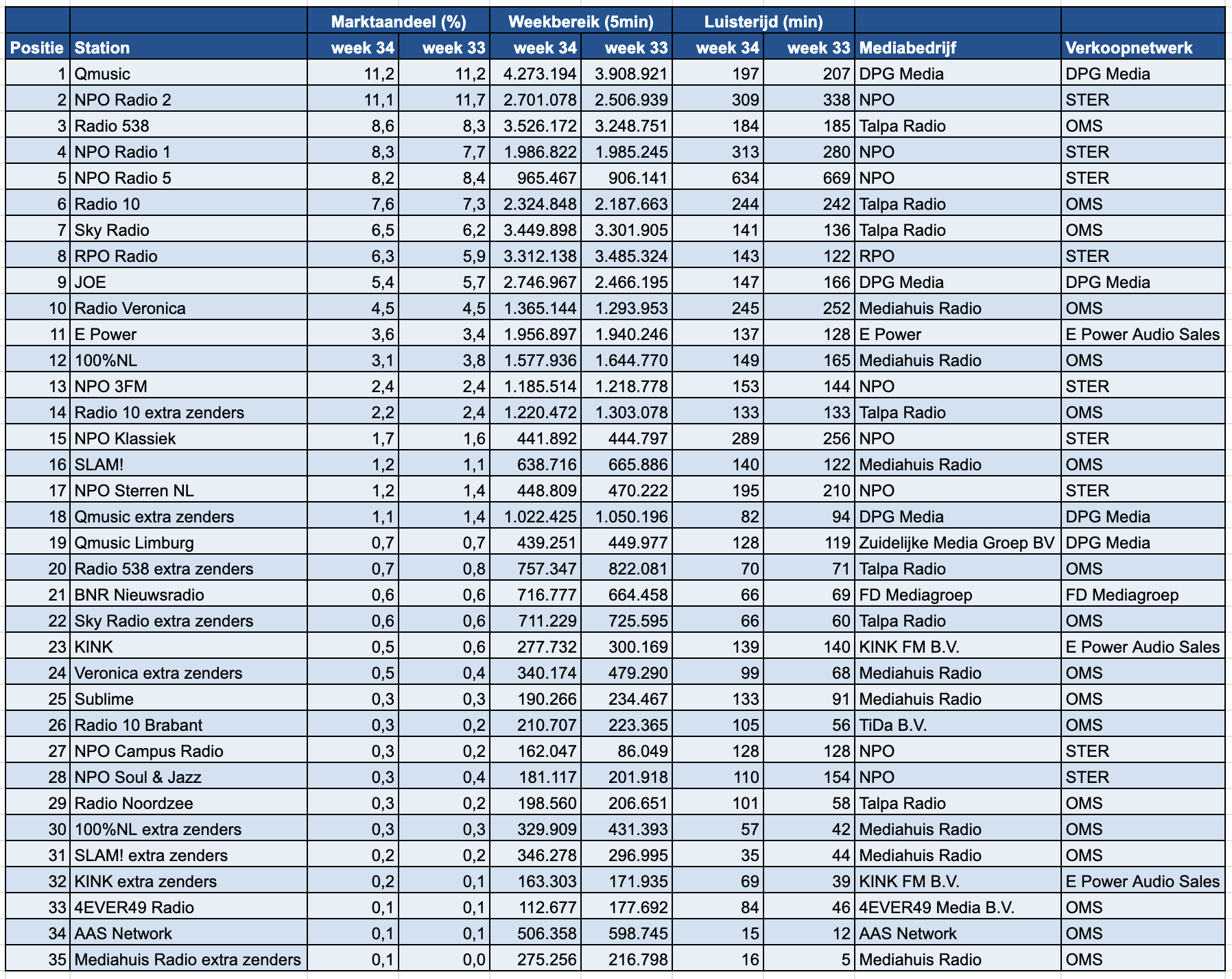 Radio 538 liet een duidelijke groei zien en klom van de vierde naar de derde plaats. Het marktaandeel steeg van 8,3 naar 9,0 procent. NPO Radio 1 verbeterde eveneens en kwam uit op 8,0 procent, een stijging ten opzichte van 7,7 procent in week 33. Deze vooruitgang leverde de nieuwszender een vierde positie op. NPO Radio 5 kende daarentegen een terugval. Het marktaandeel daalde van 8,4 naar 8,0 procent, waardoor de zender zakte van de derde naar de vijfde plaats.