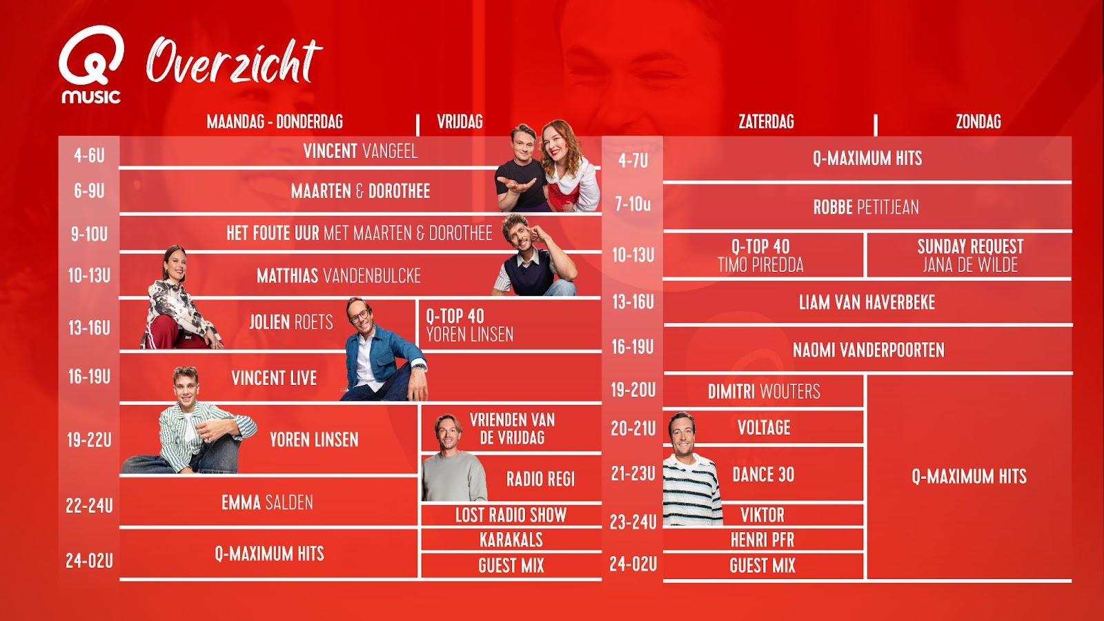 Naast vertrouwde stemmen komt Qmusic ook met nieuwe gezichten en feestelijke programmering in het weekend. Robbe Petitjean, eerder bekend van Bruzz, presenteert de weekendochtenden van 07:00 tot 10:00. Naomi Vanderpoorten krijgt een eigen weekendshow van 16:00 tot 19:00 na het blok van Liam Vanhaverbeke (13:00 - 16:00).