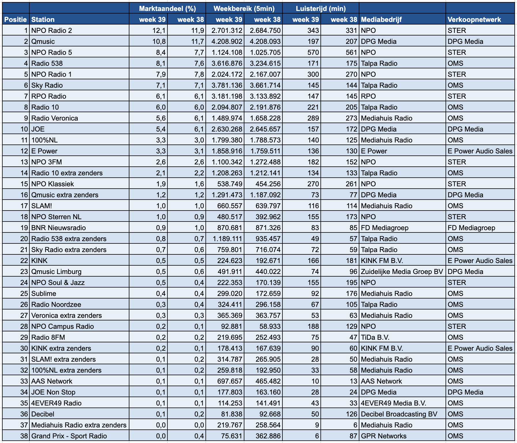 NPO Radio 5 noteert een opvallende groei en stijgt naar de derde plaats met een marktaandeel van 8,4%, tegenover 7,7% in week 38. Daarmee gaat het station voorbij aan NPO Radio 1 en Radio 538. Vooral de luistertijd van NPO Radio 5 laat een hoog niveau zien met 570 minuten, waar dit in de week ervoor 561 minuten was. Radio 538 stijgt eveneens en neemt met 8,1% de vierde positie in, na een week eerder nog 7,6% te hebben behaald. NPO Radio 1 verliest terrein en daalt naar de vijfde plaats met 7,9%, tegen 7,8% in de week ervoor.