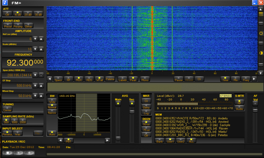 Geplaatst 25 december 201212 jr. Tussen de -40 en +40. Je ziet net dat het stereo is. Signaal is hier slechter dan Danceradio, ondanks dat het harder binnen komt. Dat heeft waarschijnlijk te maken met de frequentie. Als je naar het singnaalvenster linksonder kijkt zie je dat aan 1 kant het signaal wordt onderdrukt. Komt door een zender die er naast zit. Hier trouwens een leuk filmpje van de ontvanger: