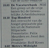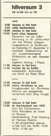 Geplaatst 3 februari 201312 jr. 25-12-1970, 25-12-1974, 25-12-1976, 31-12-1978 1984 24-12-1984 t/m 29-12-1984 elke dag een uurtje tussen 18:00 en 19:00 uur. 1985 Datum klopt niet! Was een zaterdag, NCRV dag op Hilversum 3. In de gidsen is ook niks terug te vinden over een uitzending van de Top 100. Ook geen opnamen uit die tijd. 1986 22-12-1986 t/m 25-12-1986 elke dag een uurtje tussen 18:00 en 19:00 uur. 1987 Data klopt. 14:00-16:00 Jeroen Soer, 16:00-18:00 Martijn Krabbé 1988 29-12-1988, 14:00-16:00 Martijn Krabbé, 16:00-18:00 Daniël Dekker 1989 28-12-1989, 14:00-16:00 Peter Teekamp, 16:00-18:00 Martijn Krabbé 1990 27-12-1990, 09:00-10:00 Daniël Dekker en Rob van Someren, 10:00-12:00 Peter Teekamp en Karel van Cooten, 12:00-14:00 Karel van Cooten en Daniël Dekker, 14:00-18:00 Peter Teekamp en Martijn Krabbé 1992 Uitgezonden door de VOO EN de TROS.09:00-10:00 Gijs Staverman, 10:00-11:00 Gijs Staverman, Karel van Cooten, 11:00-12:00 Karel van Cooten, 12:00-13:00 Karel van Cooten en Rob Stenders, 13:00-14:00 Rob Stenders, 14:00-15:00 Rob Stenders en Rob van Someren, 15:00-16:00 Rob van Someren, 16:00-18:00 Daniël Dekker. 1993 Geen info in de gidsen over een top 100. 1999 26-12-1999 van 09:00-18:00. Verdere gegevens ontbreken. 2000 30-12-2000 van 09:00-18:00. Verdere gegevens ontbreken. 2001 Geen gids van die week beschikbaar. Zo, kan je weer vooruit :)