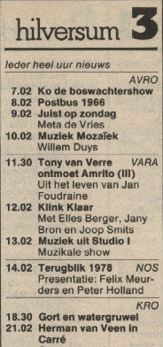Geplaatst 3 februari 201312 jr. In 1978 werd het jaaroverzicht uitgezonden op zondag 31 december van 14.00 tot 18.30. De presentatie was in handen van Felix Meurders en Peter Holland. In 1983 werd het jaaroverzicht verspreid uitgezonden tussen zaterdag 24 december en zaterdag 31 december 1983 tussen 18.00 en 19.00 uur, op zondag 25 december werd het jaaroverzicht uitgezonden tussen 18.00-20.00 uur en gepresenteerd door Frits Spits en Tom Blomberg. In 1984 werd het jaaroverzicht uitgezonden tussen maandag 24 december en zaterdag 29 december 1984. Alle dagen tussen 18.00 en 19.00 uur m.u.v. woensdag 26 december 1984 toen tussen 16.00 en 19.00 uur. De presentatie was in handen van Frits Spits en Tom Blomberg. Groetjes, Frank.