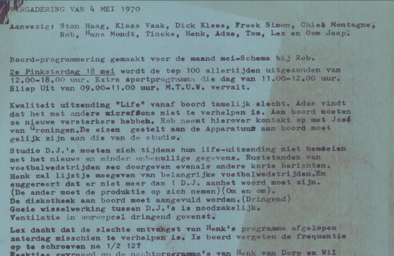Geplaatst 26 augustus 201510 jr. Vergaderingen bij Veronica waren als een z.g "landdag", vaak erg chaotisch. En ook kregen soms dj's het met elkaar aan de stok. dat kon hoog oplopen. Eén vergadering staat mij nog verg bij, Klaas Vaak ( Tom Mulder) kreeg bonje met Tineke, en dat liep zo hoog op dat Tinus het pand verliet en Klaas ( Tom) op de balkon van de kamer van Out stond te schreeuwen of ze dan toch maar weer terug wilde komen......Ja, vriendjes, het was me soms wat. Tegenwoordig kunnen we er om lachen. De vergadering waaruit Stan citeert in deze bovenstaande Popmix daar heb ik geen verslag meer van en veel weet ik er ook niet meer van. Wel heb ik nog een verslag van de dj vergadering van 4 mei 1970. (4mei?, hielden we dan wel een minuut stilte?). Een klein stukje uit die vergadering......: ©Stichting Norderney. Ook in dit nummer een stukje over plugger Marc de Raaff. ( special voor forum lid Henk Roos, Marc woonde in de Mozartstraat , vlak bij jou dus ). Kijk maar naar de pijlen waar wij woonden, en jij woonde toch met "piratenzender" in de cirkel?