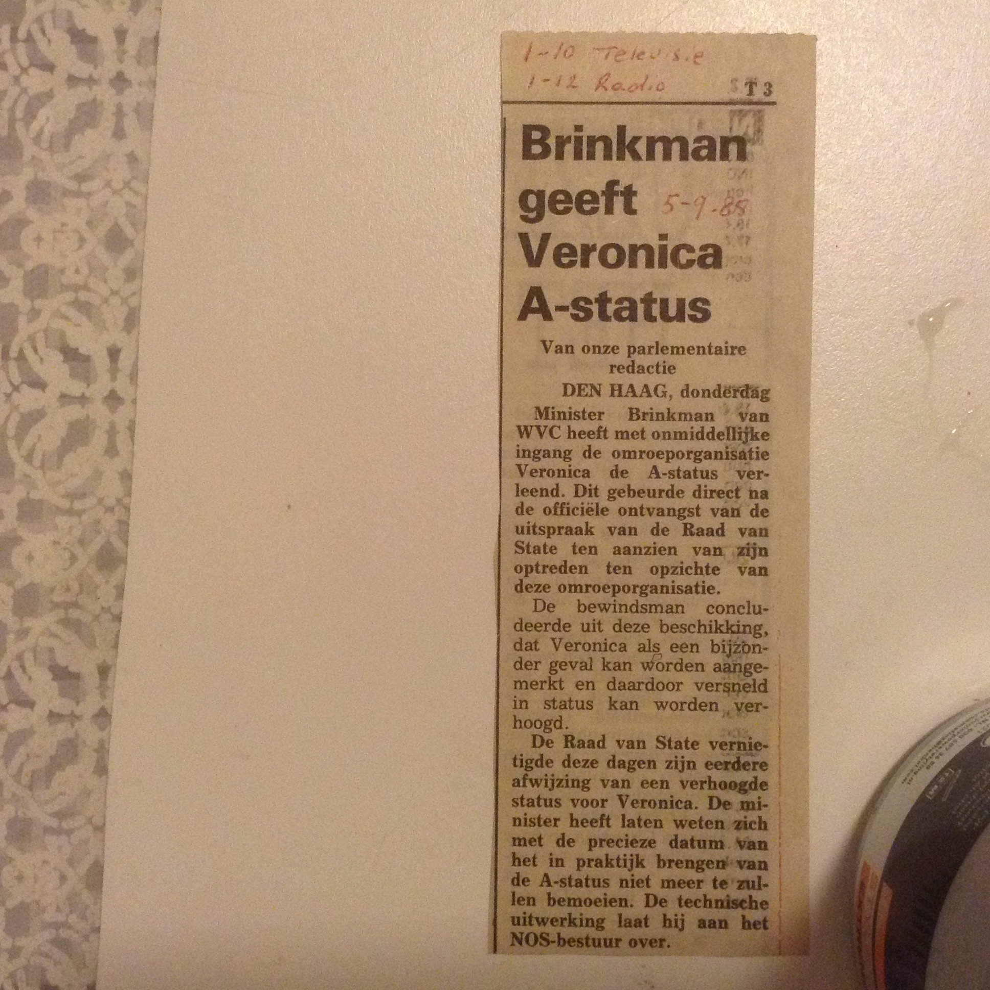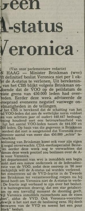Geplaatst 28 juli 20169 jr. Op 13 juni 1985 verscheen het volgende bericht over de afwijzing van de A-Status voor Veronica. Eelco Brinkman in de voetsporen van Harry van Doorn als je dan leest het geneuzel met cijfers alsof Veronica de grens van 450.000 'echte leden' niet zou hebben gehaald. (er ontbreekt helaas wat aan de linkerkant van het artikel) . Zoals je boven al hebt kunnen lezen wordt deze beslissing later dat jaar door een uitspraak van de Raad van State alsnog teruggedraaid. Gr, Melle 28 juli 20169 jr. bewerkt door melle