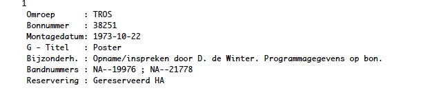 Geplaatst 6 oktober 20169 jr. Grappig Edwin, Het waren deze tapes en ik denk dat ze nog bij B&G staan. De "bandwissel" zou in de uitzending op 28'55" moeten gezeten hebben. Ze hebben de zaak op de 22ste gemonteerd. En er van uitgaande dat het een uur duurde zijn de laatste minuten niet uitgezonden. Wel raar die toontjes in het begin. Ik heb de banden wel eens in m'n handen gehad maar daar stonden ze niet op……..