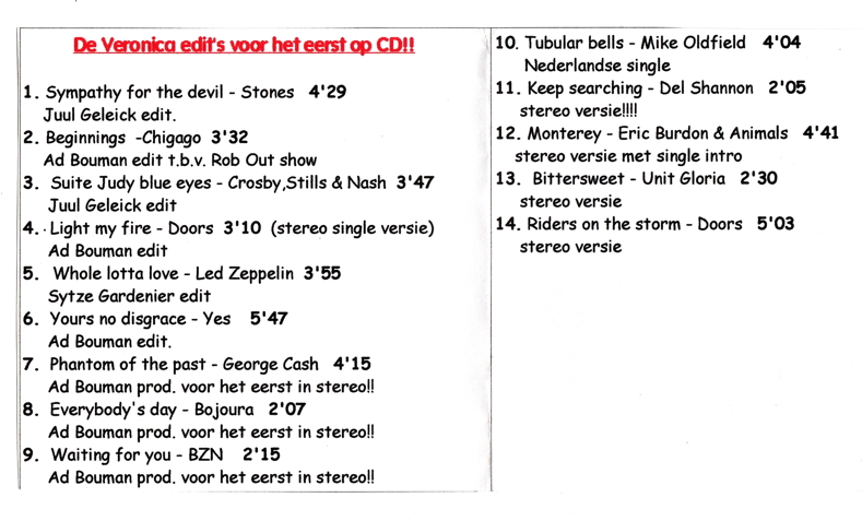 Geplaatst 23 januari 20178 jr. Op 22-1-2017 om 21:34 zei Juul: Heren, leuk jullie reacties. Waardeer ik na al die jaren. Eerst, ik heb geen idee hoe zoiets op You Tube moet. En ik ben met heel andere dingen bezig……."archief opruimen". Voor Rob, nee die is het niet. Ze hebben bij Polydor-Ned wel het zelfde label nummer gebruikt maar een ander matrix nummer weet ik nog. Omdat het natuurlijk eigenlijk niet mocht hé van Atlantic in de USA. En zo viel het niet op. En in de boeken en release lijsten was er niks aan de hand. (lees het verhaal van Harry nog maar eens ) Er was nog geen Internet dus….. De suggestie van Rob is niet de goed dus. "mijn knip"zit op 2'51. "Mijn" single is totaal 3'44" in Nederland. We kregen later via de Billboard service nog wel een edit binnen dacht ik, maar die vond Lex niet goed genoeg………Ja, zo ging dat, hij was de baas. Ik heb een paar jaren terug de knip nog eens nagemaakt Stereo in ProTools op m'n werk en wat latere bijzondere versie's op een CD gezet en die in een oplage van welgeteld 3 ex. gemaakt. Ja, collector's item dus. Juul De singles van The Stones, Led Zep en The Doors (Riders) heb ik hier staan. Van Light My Fire een Duitse knip uit '67 van 2'50. Ik hoor overigens de meerwaarde van die 20 seconden extra niet. Van Beginnings heb ik twee versies, één Duitse uit 1969 (met op de B-kant Colour My World en op de hoes 'Aus das Neue Doppel Album).Daar duurt Beginnings 2'45. En ik heb een single uit 1973 (Beginnings/Saturday In the Park). De is wel in NL gemaakt. In '73 echter was Out al gestopt met de late middagshow en dus ook met Beginnings. Deze single duurt 2'58. Toevallig draaide Rob Stenders vorige week op Radio 2 Beginnings in de Ad Bouman knip. Hij zei het er expliciet bij. Edwin 23 januari 20178 jr. bewerkt door rauhfaser