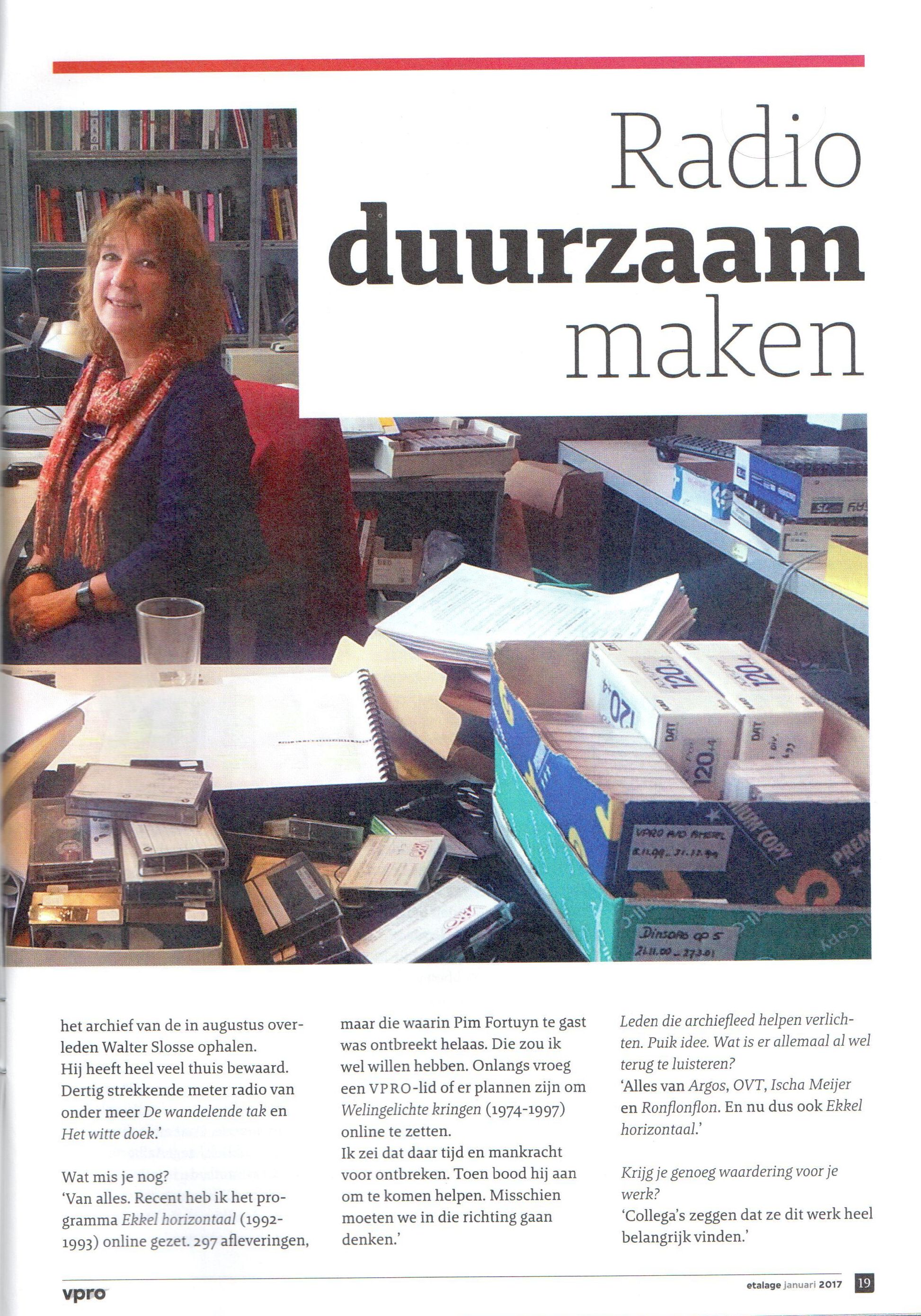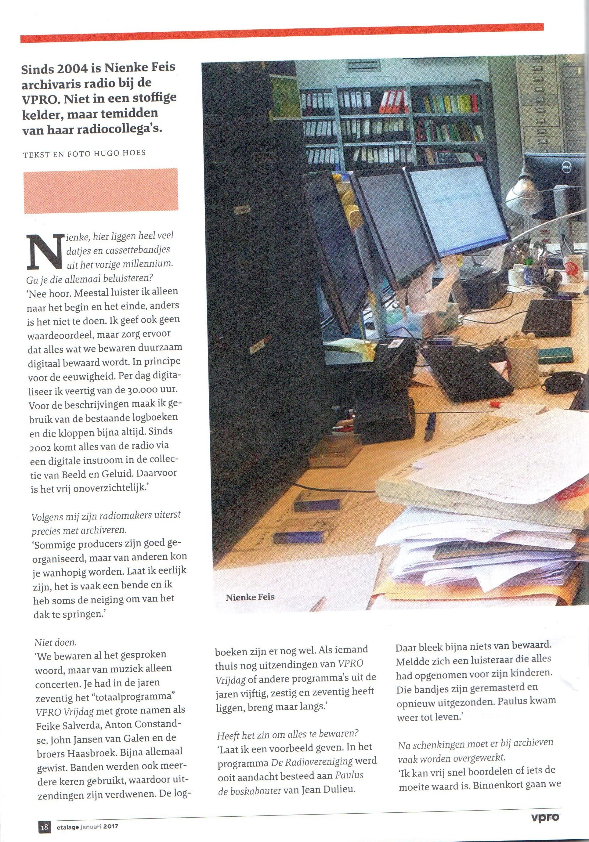 Geplaatst 23 januari 20178 jr. VPRO-radio archivaris Nienke Feis zoekt oude VPRO-programma's. Zo blijkt er niet veel meer te zijn van VPRO Vrijdag uit de jaren '70. Banden zijn gewist of meerdere keren gebruikt. In VPRO Etalage (uitgave voor leden) vertelt ze over haar werk.