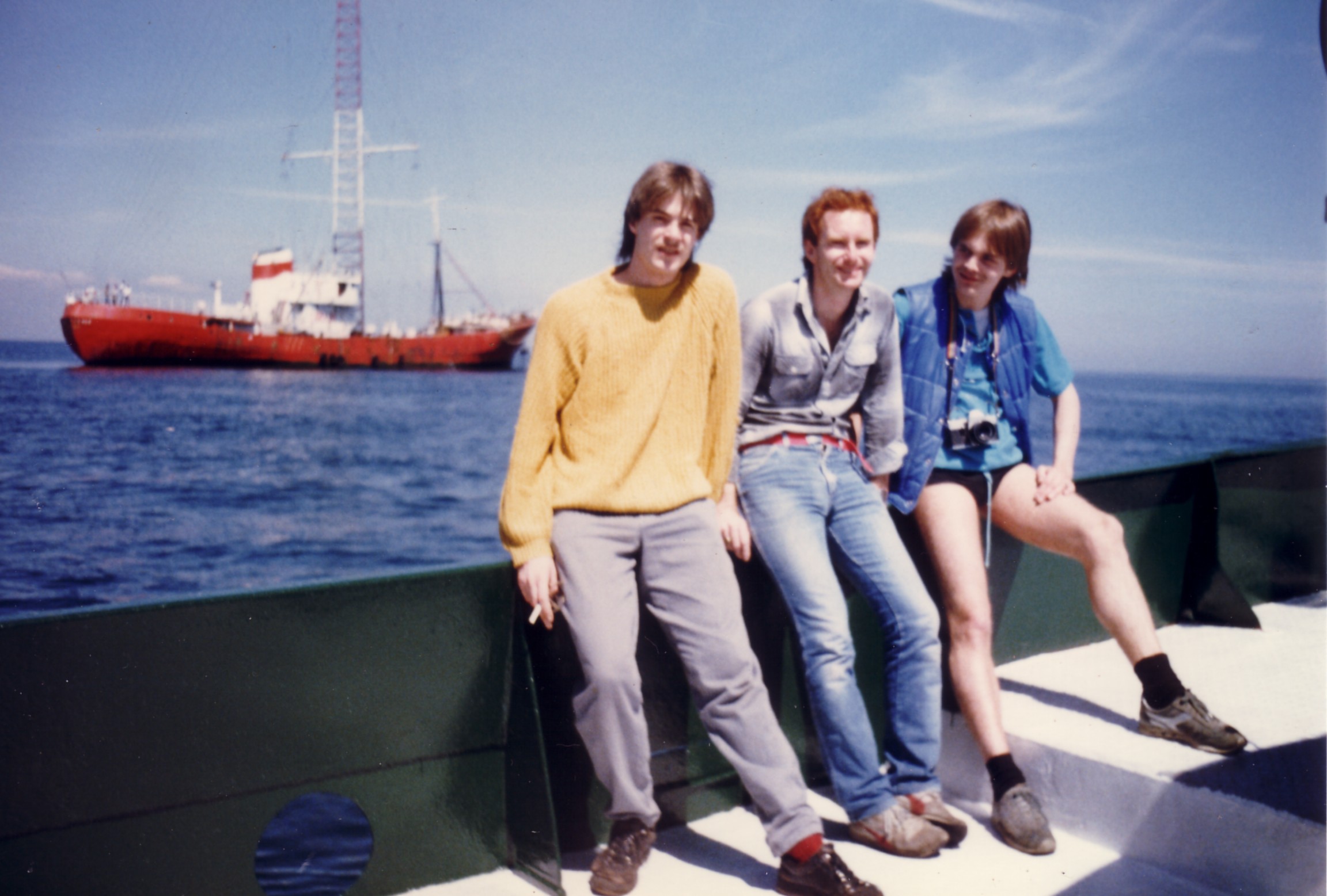 Geplaatst 28 maart 20178 jr. 2 uur geleden zei Harm ten Brink: Leuk, ik kwam dit draadje bij toeval tegen. Scan je de foto's of de negatieven? Ik heb nog een doos vol dia's die bijna niemand heeft gezien. Hier een foto uit jouw 'doos', Mark Stam, Jan Veldkamp en ikzelf. Dit was volgens mij vlak nadat die centrale in Tjernobyl de geest gaf. Dag Harm, Ik scan de foto's. De negatieven zitten allemaal in mapjes. Het is te veel werk om dat uit te zoeken. De foto van jou, Jan en Mark zal inderdaad rond de Tsjernobyl explosie van 26 april 1986 genomen zijn. De radioactieve stof heeft ieder geval de beentjes niet roder of bruiner kunnen maken... Ze zeggen dat de incubatie tijd dertig jaar is, dus hoe staan je benen er nu voor? Jullie staan op de Windy die toen netjes in de verf was gezet. Echter onze Kaapverdiaanse bemanning had voor het dek geen antislip verf gebruikt. Hadden ze ook nog nooit van gehoord. Bij het minste spatje zeewater veranderde het dek in een heuse glijbaan. Later hebben het opgeschuurd en fijn grit door de verf gedaan, zodat het dek ruwer werd. Heb nog een foto van Daniël, de Kaapverdiaanse jongen die permanent aan boord verbleef in Duinkerken. Herinner me nog dat we plotseling aan boord stapten om weg te varen en hij daar met een 'madammeke' in de weer was. In die tijd konden we niet bellen en de jongens moesten altijd in de buurt van het schip blijven. Achteraf bezien een moderne vorm van slavernij, maar zo zag niemand dat. Zij niet en wij ook niet. Tijden veranderen, terug naar de onze... Salut Leendert