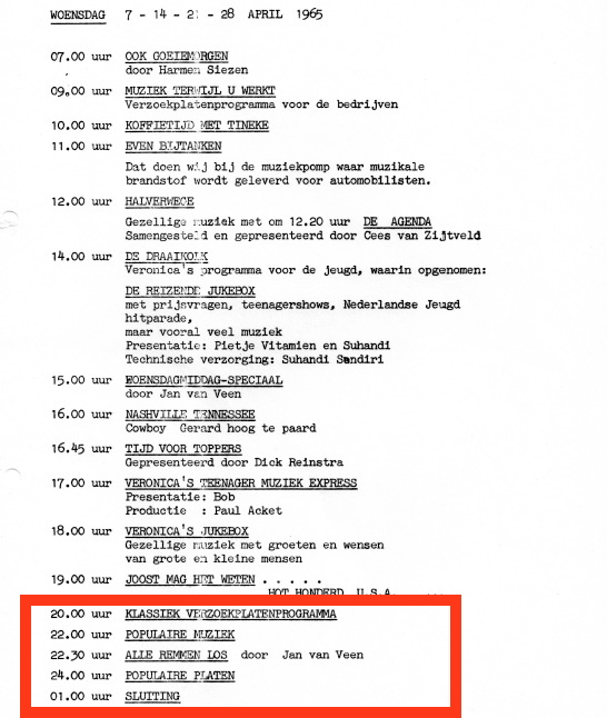 Geplaatst 9 mei 20178 jr. Als tiener dacht ik er waarschijnlijk anders over, maar nu kan ik met veel plezier naar zo’n programma met jazz en showmuziek luisteren. Ik neem aan dat Tony Vos dat ook met plezier draaide; hij was zelf immers ook al sinds de jaren vijftig actief in het genre. Hoe kom je trouwens aan die precieze datum, Juul? In jouw verhaal op de website (http://www.norderney.nl/historie_1962_4.html) lees ik: ‘Op 30 november 1962 werd besloten de zendtijd andermaal uit te breiden, nu in de avond- en nacht-uren. Op vrijdag- en zaterdagavond werd er dansmuziek uitgezonden tussen 23.00 en 01.00 uur.’ Dat wekte bij mij de indruk dat er voor die tijd niet van zulke nachtuitzendingen waren.
