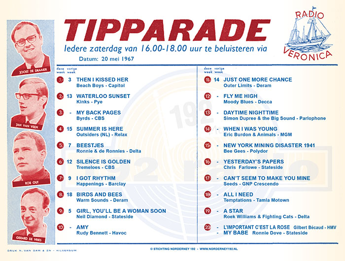 Geplaatst 20 mei 20178 jr. Ik hoor net dat er twee nummer 20's in de tipparade van 20 mei 1967 staan? Dan moet het lijstje even opnieuw geplaatst worden met de juiste gegevens, dus ook met Ronnie Dove erin. Dat gebeurde wel vaker na 15 juli 1967 dus op zichzelf niet zo gek. Maar dan moet het lijstje wel met de juiste nummers geplaatst worden voor de verzamelaars, waarvan ik er eentje ben. Nog een week of zeven, dan liggen de tiplijsten vast, want het staat gedrukt in dat blauwe boekje. Wel zou de lijst van 15 juli 1967 dan nog even geplaatst moeten worden met de standen van de week ervoor. Ik wacht het even af.