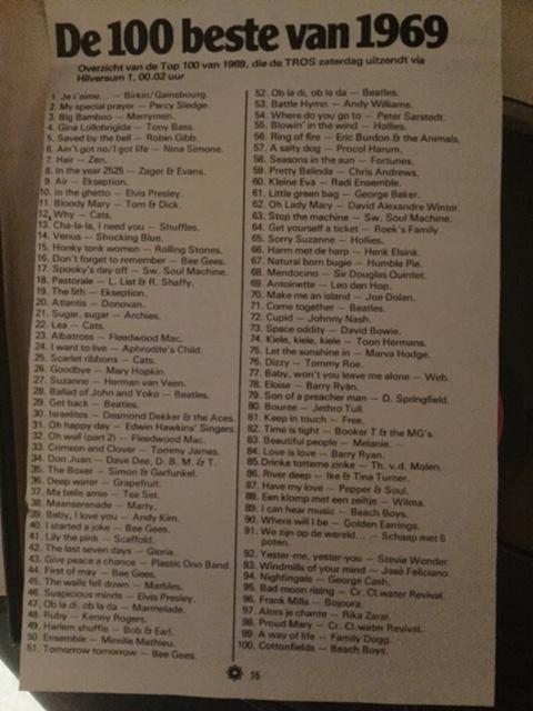 Geplaatst 13 december 20177 jr. Uitgewerkt; 1 Jane Birkin & Serge Gainsbourg – Je T'aime Moi Non Plus 2 Percy Sledge - My Special Prayer 3 The Merrymen - Big Bamboo 4 Tony Bass - Gina Lollobrigida 5 Robin Gibb - Saved By The Bell 6 Nina Simone - Ain't Got No-I Got Life 7 Zen - Hair 8 Zager & Evans - In The Year 2525 9 Ekseption - Air 10 Elvis - In The Ghetto 11 Tom & Dick - Bloody Mary 12 Cats - Why 13 The Shuffles - Cha-La-La, I Need You 14 Shocking Blue - Venus 15 The Rolling Stones - Honky Tonk Women 16 The Bee Gees - Don't Forget To Remember 17 Swinging Soul Machine - Spooky's Day-Off 18 Liesbeth List met Ramses Shaffy - Pastorale 19 Ekseption - 5th Symphony Beethoven 20 Donovan - Atlantis 21 The Archies - Sugar Sugar 22 The Cats - Lea 23 Fleetwood Mac - Albatross 24 Aphrodite's Child - I Want To Live 25 The Cats - Scarlet Ribbons 26 Mary Hopkin - Goodbye 27 Herman Van Veen - Suzanne 28 The Beatles - The Ballad Of John And Yoko 29 Beatles featuring Billy Preston - Get Back 30 Desmond Dekker & The Aces - Israelites 31 The Edwin Hawkins Singers - Oh Happy Day 32 Fleetwood Mac - Oh Well! 33 Tommy James & The Shondells - Crimson And Clover 34 Dave Dee, Dozy, Beaky, Mick and Tich - Don Juan 35 Simon & Garfunkel - The Boxer 36 Grapefruit - Deep Water 37 Tee-Set - Ma Belle Amie 38 Marty - Maanserenade 39 Andy Kim - Baby, I Love You 40 The Bee Gees - I Started A Joke 41 The Scaffold - Lily The Pink 42 Gloria - The Last Seven Days 43 Plastic Ono Band - Give Peace A Chance 44 Bee Gees - First Of May 45 Marbles - The Walls Fell Down 46 Elvis Presley - Suspicious Minds 47 The Marmalade - Ob-La-Di Ob-La-Da 48 Kenny Rogers and The First Edition - Ruby Don't Take Your Love To Town 49 Bob and Earl - Harlem Shuffle 50 Mireille Mathieu - Ensemble 51 The Bee Gees - Tomorrow Tomorrow 52 Beatles - Ob-La-Di, Ob-La-Da 53 Andy Williams - Battle Hymn Of The Republic 54 Peter Sarstedt - Where Do You Go To (My Lovely) 55 Hollies - Blowin' In The Wind 56 Eric Burdon and The Animals - Ring Of Fire 57 Procol Harum - A Salty Dog 58 The Fortunes - Seasons In The Sun 59 Chris Andrews - Pretty Belinda 60 Het Radi-Ensemble - Huil Maar Niet, Kleine Eva! 61 George Baker Selection - Little Green Bag 62 David Alexandre Winter - Oh Lady Mary 63 Swinging Soul Machine - Stop The Machine 64 Roek's Family - Get Yourself A Ticket 65 The Hollies - Sorry Suzanne 66 Henk Elsink - Harm Met De Harp 67 Humble Pie - Natural Born Bugie 68 Sir Douglas Quintet - Mendocino 69 Leo Den Hop - Antoinette 70 Joe Dolan - Make Me An Island 71 Beatles - Come Together 72 Johnny Nash - Cupid 73 David Bowie - Space Oddity 74 Toon Hermans en De Driedonken Blaaskapel - Kiele, Kiele, Kiele ... 75 Marva Hodge & The Moody Sec - Let The Sun Shine In 76 Tommy Roe - Dizzy 77 The Web - Baby Won't You Leave Me Alone 78 Barry Ryan - Eloise 79 Dusty Springfield - Son-Of-A Preacher Man 80 Jethro Tull - Bourée 81 The Free – Keep In Touch 82 Booker T and The MG's - Time Is Tight 83 Melanie - Beautiful People 84 Barry Ryan - Love Is Love 85 Thijs Van Der Molen - Drinke Totteme Zinke 86 Ike & Tina Turner - River Deep-Mountain High 87 Pepper And Soul - Have My Love 88 Wilma - Een Klomp Met Een Zeiltje 89 The Beach Boys - I Can Hear Music 90 Golden Earrings - Where Will I Be 91 Adèle Bloemendaal & Leen Jongewaard & Piet Römer - We zijn toch op de wereld om mekaar te helpen, niewaar? 92 Stevie Wonder - Yester-Me Yester-You Yesterday 93 José Feliciano - The Windmills Of Your Mind 94 George Cash - Nightingale 95 Creedence Clearwater Revival - Bad Moon Rising 96 Bojoura - Frank Mills 97 Rika Zaraï - Alors Je Chante 98 Creedence Clearwater Revival - Proud Mary 99 The Family Dogg - A Way Of Life 100 Beach Boys - Cotton Fields