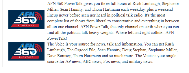 Geplaatst 1 mei 20187 jr. 1 uur geleden zei Paul: In de jaren tachtig luisterde ik wel, gewoon omdat ik toen AFN kon ontvangen en vanwege het Amerikaanse sfeertje Heb er vanaf begin jaren 70 regelmatig naar geluisterd, eerst vooral naar de dj programma's met b.v. de Wolfman, Don Tracy, Mary Turner en Laurie Allen, in deze eeuw luisterde ik tot een jaar of 5 geleden, meer naar de informatie/nieuwsprogramma's en de talkshows van links/rechts, meestal via de zender uit Frankfurt via de 873 kHz.