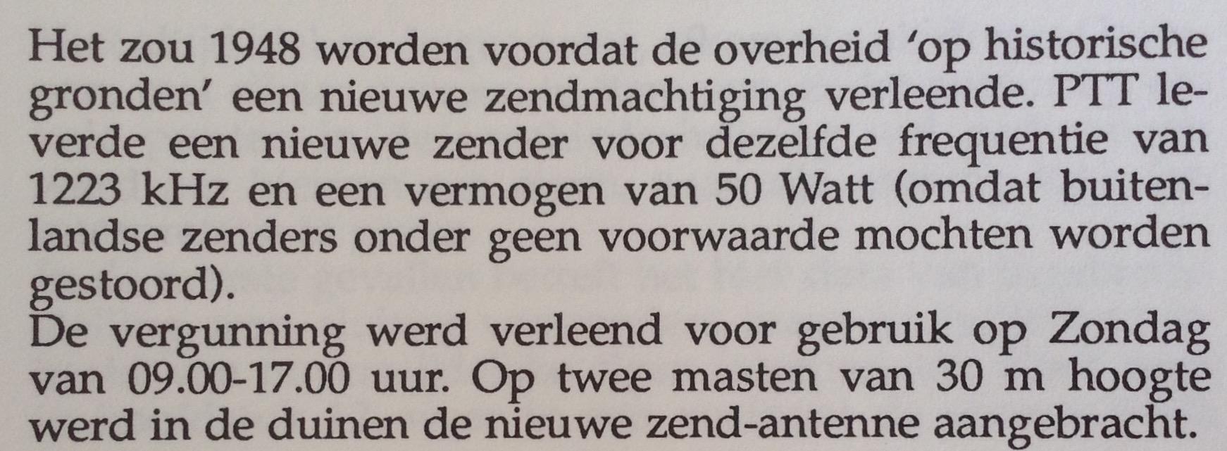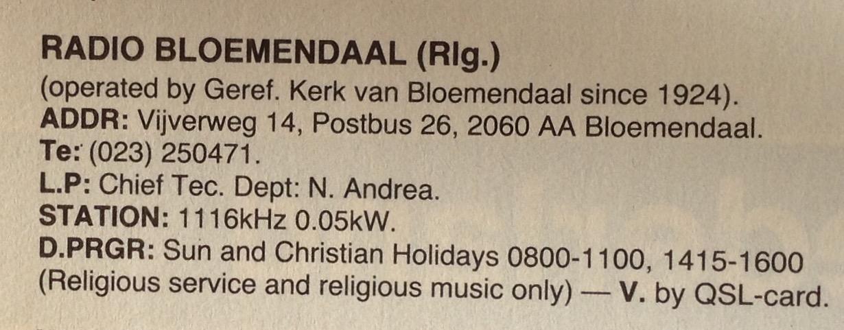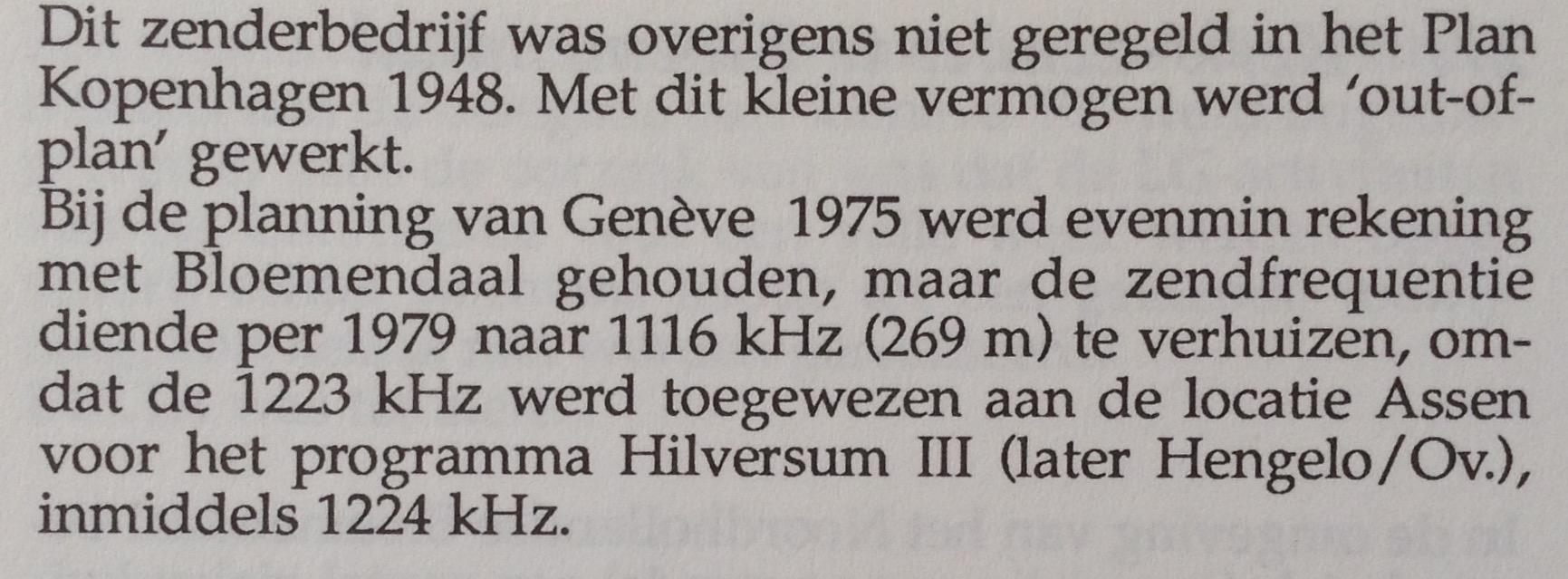 Geplaatst 26 september 20187 jr. Auteur Dank, Thijs. Dit geeft wat meer duidelijkheid over het gebruik van de middengolffrequenties door Radio Bloemendaal. In november 1978 heb ik op verzoek van toenmalig hoofdredacteur Robert Briel in het Veronica-blad een artikel geschreven over de inwerkingtreding van het Plan van Genève. Toen werd ook duidelijk dat de Nederlandse vertegenwoordiging in 1975 tijdens de besprekingen voor dit plan geen rekening had gehouden met Radio Bloemendaal. Toen op 23 november 1978 het Plan in werking trad bleef Radio Bloemendaal dan ook uitzenden op 1223 kHz, want dat was immers de frequentie waarvoor door de Nederlandse autoriteiten een vergunning was afgegeven. Dat leverde in de winterperiode wel een irritante 1000 Herz-fluittoon op, omdat andere zenders op 23 november 1978 netjes van 1223 naar 1224 kHz waren gegaan, conform het Plan. Onmiddellijk na inwerkingtreding van het Plan van Genève is door de PTT echter wel een procedure opgestart om een andere frequentie voor de kerkzender in de wacht te slepen. Deze procedure is opgenomen in het Plan, en behelst overleg met buitenlandse administraties die eveneens gebruik maken van de beoogde frequentie. Dat overleg duurde een aantal maanden en uiteindelijk werd gekozen voor de frequentie 1116 kHz, waarna Radio Bloemendaal van de Nederlandse autoriteiten een nieuwe vergunning kreeg en per 19 augustus 1979 gebruik ging maken van de huidige frequentie. Radio Bloemendaal maakt dus weliswaar geen gebruik van een in 1975 in het kader van het Plan van Genève internationaal gecoördineerde frequentie, maar wel van een frequentie die conform de daarvoor in het Plan opgenomen procedure na inwerkingtreding van het Plan in gebruik kon worden genomen. Piet.