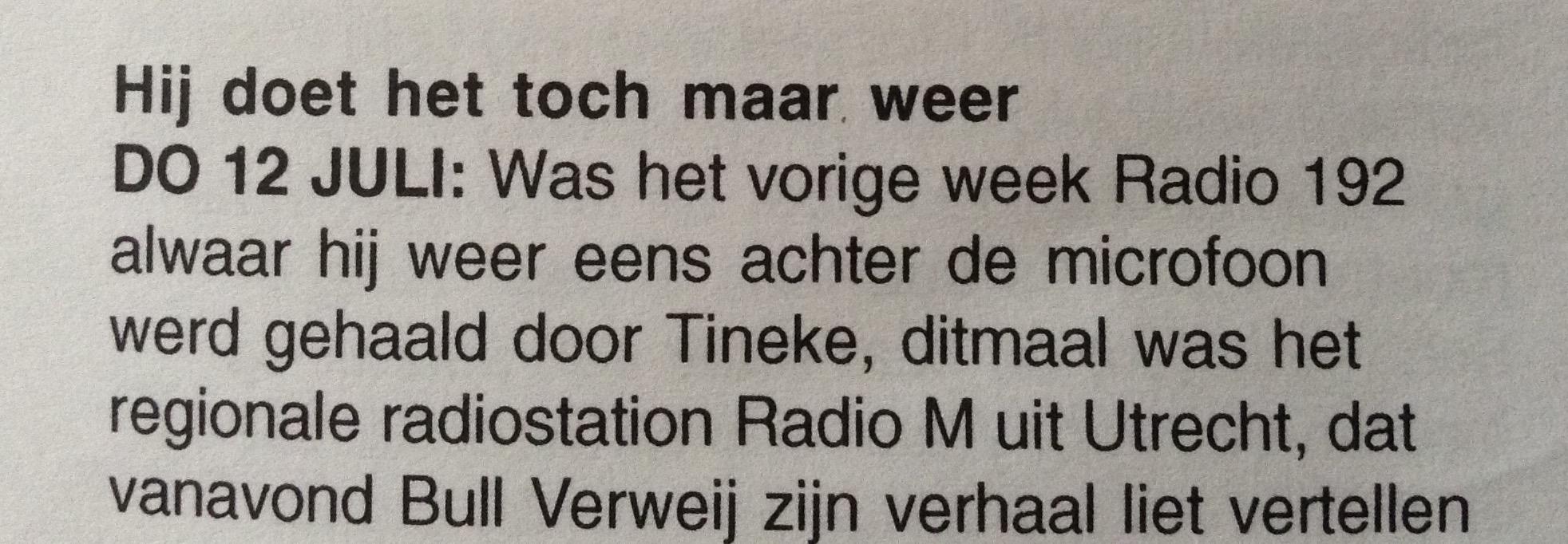 Geplaatst 23 september 20187 jr. s het niet van de CD "Het grote Bull Verweij interview" ? ,die door heren Knot en Boonstra werd gemaakt ? Update: Die CD heeft als kenmerk 1994. En in 1999 maakten wij reclame voor die CD. Maar ik heb deze upload-download niet afgeluisterd dus weet niet of het dezelfde is. dit is in ieder geval de tracklist van de CD: 1. Introductie, de jaren bij de Handelsbank 2. Oorlogsjaren, in de cel 3. broer Dirk en het familie bedrijf Universum 4. Kloof tussen sokken en radio's, de VRON 5. Radio Veronica wordt geboren 6. Spannende uitvaart te Emden, een wankele start. 7. Zoektocht naar een vlag. 8. Vogelvrij op de Noordzee 9. 5 Miljoen luisteraas maar geen adverteerders 10. Wie waren de geldschieters van het eerste uur? 11. Nur Die, de eerste echte adverteerder 12. Veronica als fatsoenlijke piraat 13. CENBC, een aanloop tot eigen Engels schip 14. Een bijzonder aanbod scheepsbouwer Verolme 15. De keuze voor laag zendvermogen. 16. Marokko als uitwijk voor de toekomst 17. Radio Polular de Mallorca, een aardigheidje 18. Kwestie Jan van Veen. 19. Kaper op de kust, financieren Radio Nordsee 20. Bom,aanslag Mebo II, de arrestatie. 23 september 20187 jr. bewerkt door Juul