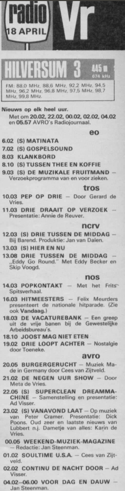 Geplaatst 9 mei 20196 jr. Populair bericht Hallo allen, Op 5 januari plaatste Martin op deze site anderhalf uur uit de Nationale Hitparade van vrijdag 18 april 1975. Ik merkte toen op dat er veel meer van deze H3-dag is bewaard. Het was zo'n dag waarop allerlei omroepen uitzonden: Na een TROS-nacht tot 5.00 uur waren er van 5.00 tot 10.00 vijf EO-uurtjes, daarna weer twee uur TROS, tussen de middag twee uur NCRV, van 14.00 tot 20.00 uur de NOS en van 20.00 tot de volgende ochtend 6.00 uur de AVRO. Van deze dag is in ieder geval ruim zes uur bewaard, verdeeld over (gedeelten van) zes programma's. Drie programma's zijn volledig: Frits Spits Verhaal, Negen Uur Show en Superclean Dreammachine. Wie de oorspronkelijke aanbieders zijn, weet ik niet meer., maar ik heb ze nog eens op een rij gezet. Of het uur van Joost met de tiplijst inderdaad van vrijdag is, weet ik niet. Mogelijk werd de Tip 30 op donderdagavond uitgezonden in die tijd. De anderhalf uur van Martin heb ik nog even mee gekopieerd. Veel plezier! Edwin 13.42-15.00 NCRV Eddy Becker Eddy Go Round - NOS Frits Spits Verhaal https://pixeldrain.com/u/oYsCCit7 1500-1600 NOS Frits Spits Verhaal https://pixeldrain.com/u/dMCFMb6R 1600-1730 NOS Nationale Hitparade Felix Meurders https://pixeldra.in/u/Hor5_L 1817-1859 Joost den Draaier Nationale Tipparade https://pixeldrain.com/u/BsAYFSUs 2100-2200 AVRO Meta de Vries Negen Uur Show https://pixeldrain.com/u/8SWJCzQA 2200-2330 AVRO Ad Visser Superclean Dreammachine – Karel Prior ’s Avonds Laat https://pixeldrain.com/u/v_rijHWu