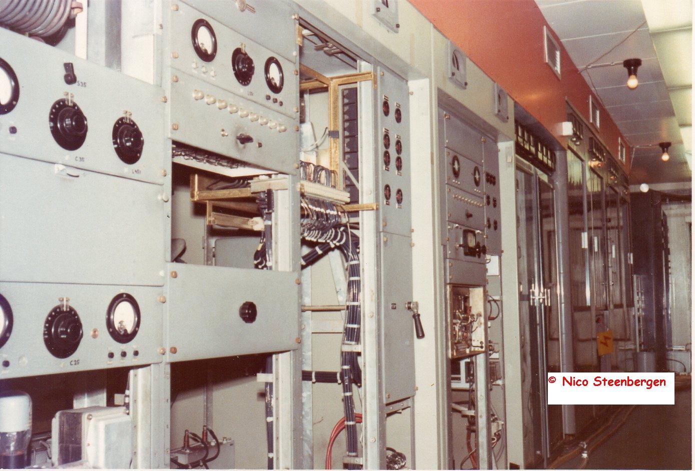 Geplaatst 7 juni 20196 jr. Info van Nico Steenbergen (PA0NHS). Links de toen al stokoude Bown Boveri KG zender die op 6205 kHz stond. Daarnaast twee glazen deuren met daarboven zes meters. Dat is de FM zender. Daarnaast een RCA op 9935 kHz. foto: ©Nico Steenbergen.