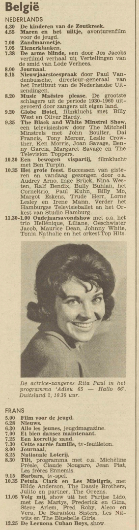 Geplaatst 24 juli 20196 jr. kijk hier eens naar Ben. https://www.delpher.nl/nl/kranten/view?query=televisie&page=2&cql[]=(date+_gte_+"31-12-1965")&cql[]=(date+_lte_+"31-12-1965")&coll=ddd&redirect=true&identifier=ddd%3A110589988%3Ampeg21%3Aa0294&resultsidentifier=ddd%3A110589988%3Ampeg21%3Aa0294 groet, Hans