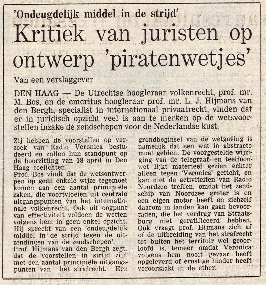 Geplaatst 26 augustus 20196 jr. 1 uur geleden zei ruudam: Tja, je vraagt je af wat er was gebeurd als ze gewoon met zn allen door waren gegaan. Ik geloof er niks van dat alles en iedereen gearresteerd zou worden. O 'Rahilly, Sylvian Tack en van Lanschoten werden nooit opgepakt al vielen ze in Ierland en Belgie onder de anti zeezender wetgeving van hun land. Opeens bedenk ik me of ook Antillianen, die hebben allemaal een NL paspoort, onder de zeezender wet vielen en vallen. Dus had Antilliaanse bemanningen op de schepen gezet. En wat was er gebeurd als de jocks en ander personeel van Veronica en Noordzee allemaal naar Curacao en Aruba waren verhuisd, en gewoon bleven doorwerken. Ook Nederlanders die voor de VOP voor de kust van Israel werkten zijn nooit opgepakt. Twee hoogleraren hebben daar een uitgebreid rapport over geschreven van 31 pagina's. Ik heb het hier in het archief zitten. Hier wel een uittreksel.