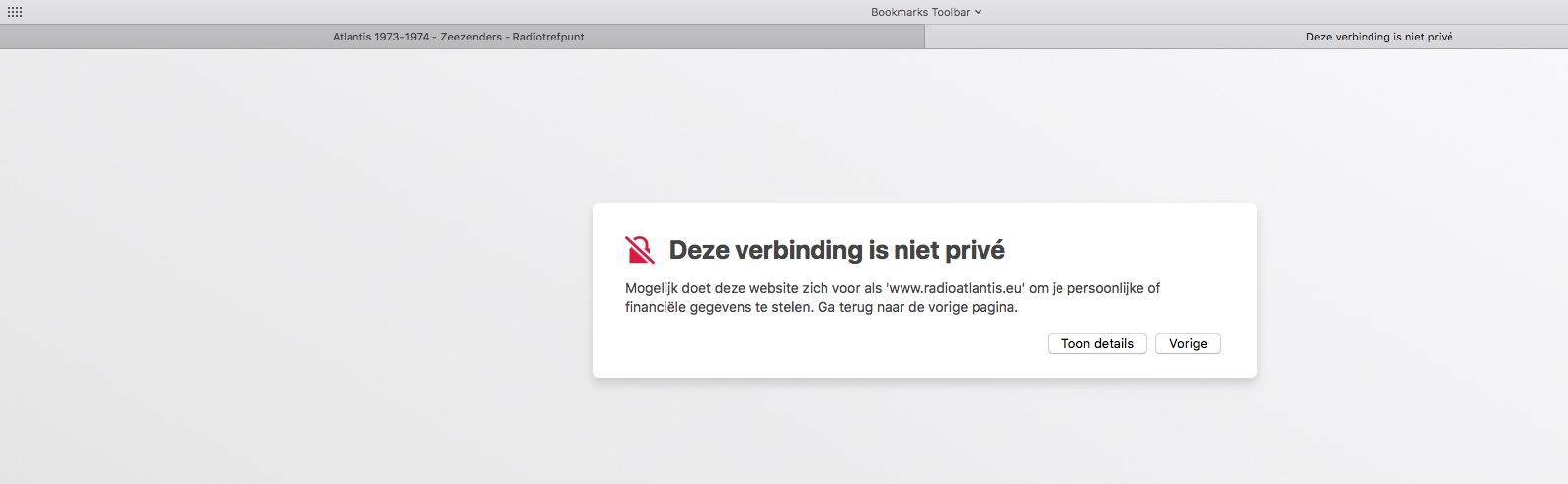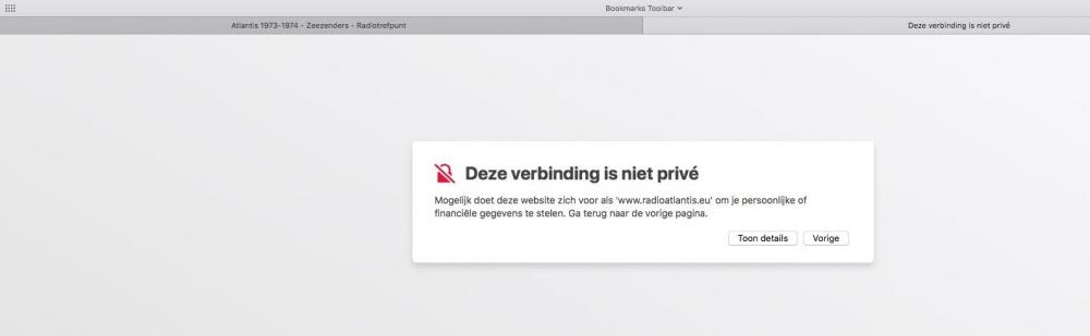 Geplaatst 24 augustus 20196 jr. 7 uur geleden zei bert ree: heeft er iemand toevallig opnames van Steve England op Atlantis 2019 van deze zomer? Ik weet niet of hij verder programma's blijft doen in september. zie onder internet radio 55 minuten geleden zei J.Vinke: Zijn er meer leden die bij de link van Leendert deze melding krijgen, https://www.radioatlantis.eu Verbinding is niet beveiligd De verbinding is onvoldoende beveiligd. Criminelen kunnen proberen je gegevens vanaf de website te stelen. Je wordt aanbevolen deze website te verlaten. URL: www.radioatlantis.eu Reden: Ongeldige naam van certificaat. De naam staat ofwel niet op de lijst met toegestane certificaten, of is met opzet uitgesloten. Certificaat bekijken Ik begrijp de risico's en wil doorgaan. Vr gr Jan Jan kreeg dit nu opeens ook rond middernacht zondag en zaterdagavond niet ik klikte terug 2 x zoiets en probleem opgelost deze oude zeerover dacht ...de boom in met dat bericht. vandaag Steve England opgenomen maar hun player stopte en heb dus programma niet volledig kunnen opnemen met mijn StreamTap Streaming Audio Recorder. Ik was helaas tijd afwijzig. Onder Internet Radio hoofdstuk download links van zondag te vinden Een stream link voor in mijn StreamWriter heb ik helaas niet om op te nemen Vriendelijke groet