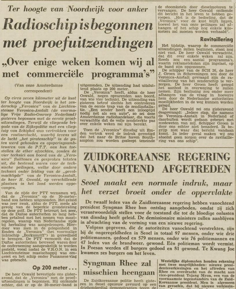 Geplaatst 18 mei 20205 jr. De eerste proefuitzendingen van Radio Veronica op 20 april 1960 waren destijds voorpaginanieuws. Zie daarvoor onderstaand artikel in het Leidsch Dagblad van 21 april 1960.