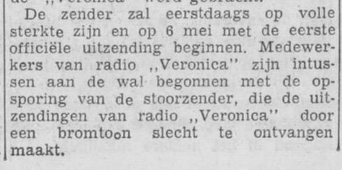 Geplaatst 18 mei 20205 jr. 2 uur geleden zei Bo Lus: Bron: Nieuwsblad van het Zuiden (3-5-1960) "wie het weet mag het zeggen" Die eerste weken na 21 april zijn wel een rommelige tijd geweest. Ik lees bij Out dat na 6 mei het schip ook nog eens werd verplaatst naar zijn plek voor de kust van Scheveningen. En de studio's gingen van Amsterdam naar Hilversum. 18 mei 20205 jr. bewerkt door Will Stevens
